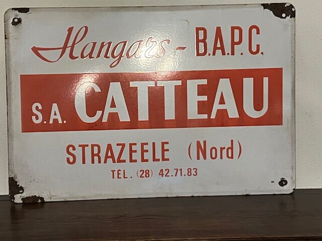 Old enameled advertising sign from the Catteau company in Strazeele, Northern France. Damage to the corners, clearly visible in the photos. In good condition. Dimensions: 60 x 40 cm.