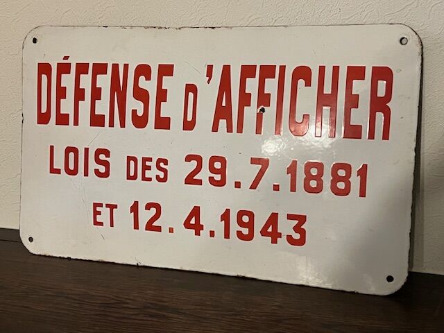 Original enamel sign from the 1940s, "Défense d'afficher" (No Posting) French origin. In good condition for its age. Embossed model, 30 x 50 cm.