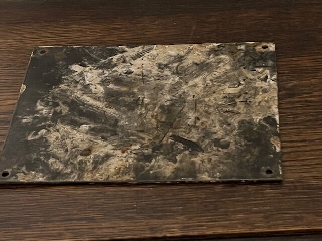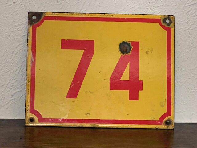 Enameled French house number 74, red lettering on a yellow background. Old, so some typical enamel damage. 14 x 18 cm.