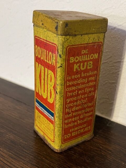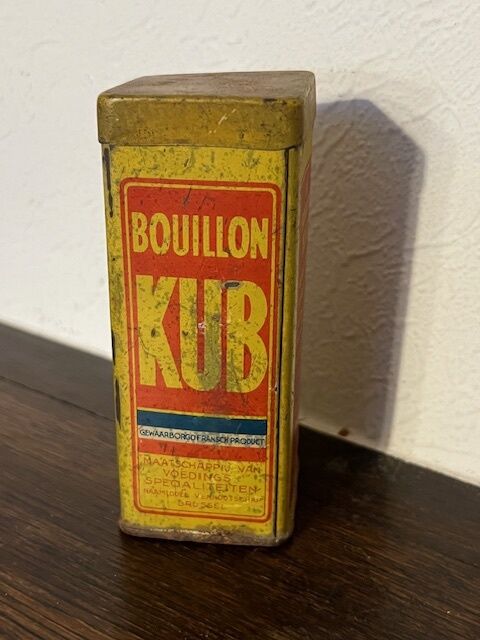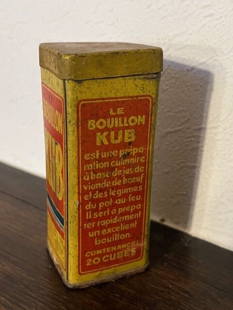 Antique small Bouillon KUB tin with tricolor ribbon. Rectangular tin with lithographed finish. Dimensions: diameter 5 cm; height 11 cm. 1930s-1940s.