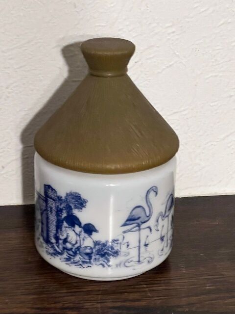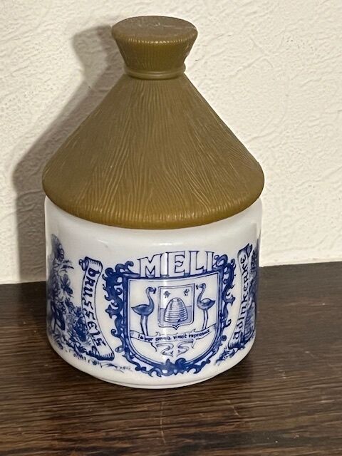 Opaline glass honey pot with a plastic lid. In very good condition. Height 14.5cm. Diameter 9cm. This one was produced by the Belgian honey manufacturer MELI from Adinkerke. This brand was once associated with an amusement park, which was acquired by Studio 100 in the late 1990s and is now operated as Plopsaland.