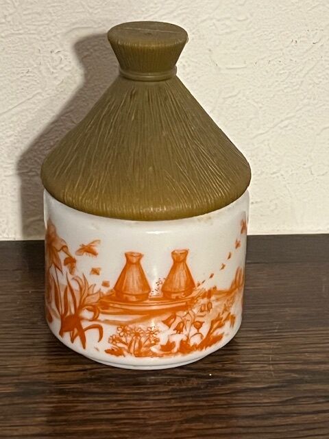 Opaline glass honey pot with a plastic lid. In very good condition. Height 14.5cm. Diameter 9cm. This one was produced by the Belgian honey manufacturer MELI from Adinkerke. This brand was once associated with an amusement park, which was acquired by Studio 100 in the late 1990s and is now operated as Plopsaland.