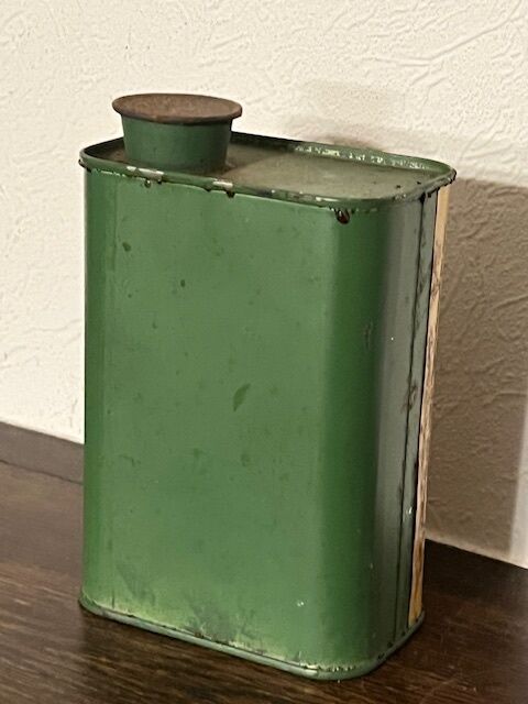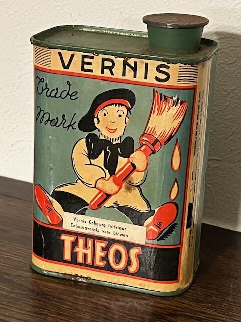 Old pot of varnish from the marque Théos, in unopened condition. Height 17cm