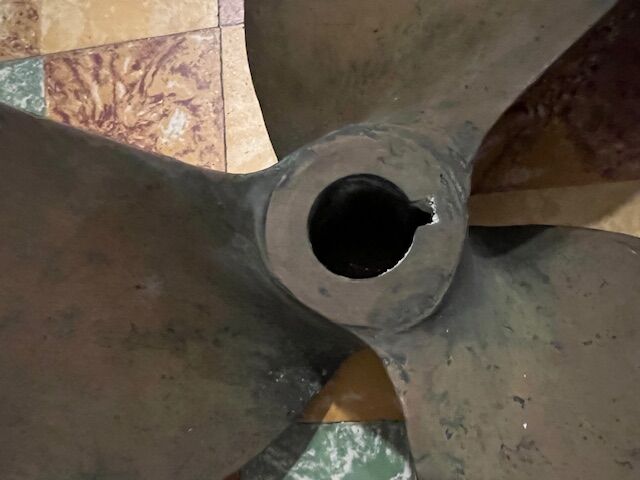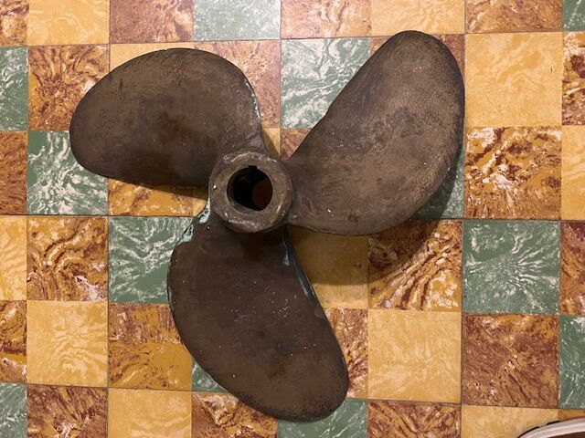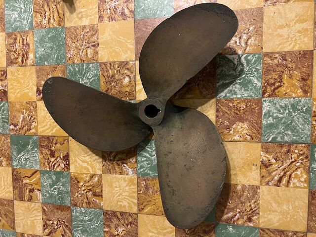 Antique bronze 3-bladed ship propeller. Radius 24cm, so the total diameter is 48cm. Decorative item.