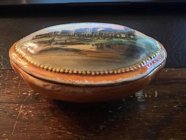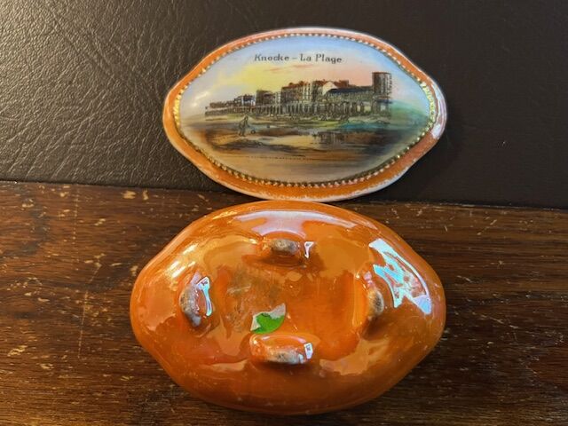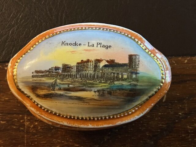 Old souvenir candy or jewelry jar from Knokke-Heist. Such souvenirs were highly sought after in the 1920s and 30s. In very good condition. 10cm wide, 6cm deep, and 4cm high.