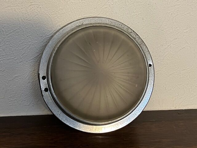 This spotlight was primarily used for interior lighting on inland vessels. They were also found in buses and similar fixtures. The ring is chrome-plated metal, the mounting plate is made of sheet steel. The glass is in perfect condition. Diameter: 17 cm. This example has the original socket and a bulb.