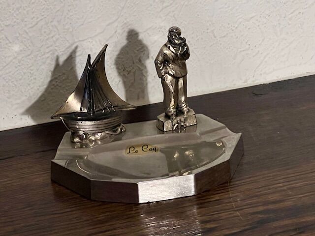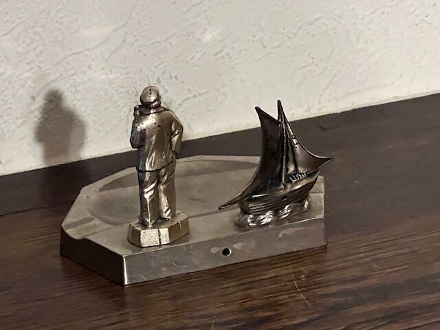 White metal (I think chrome-plated spelter) ashtray made as a souvenir from the coast. In this case, De Haan. It features a fisherman and a fishing boat. Width 10cm, height 7cm. In very good condition.