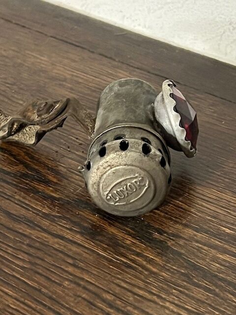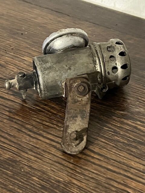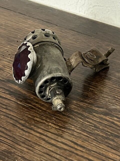 Antique Luxor carbide lamp, from a bicycle or moped. In very good condition with a beautiful old patina. Comes complete with mounting bracket. The acetylene is generated in the reservoir of the front light and transferred to the rear light via a rubber hose. The total length of the lamp is 10 cm.
