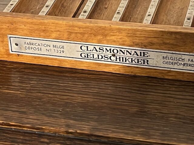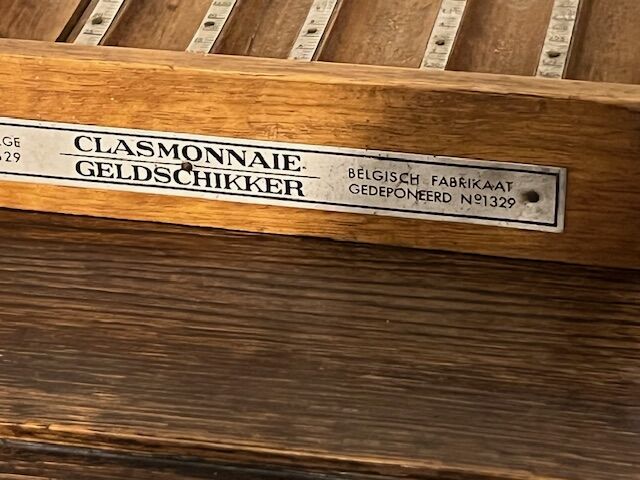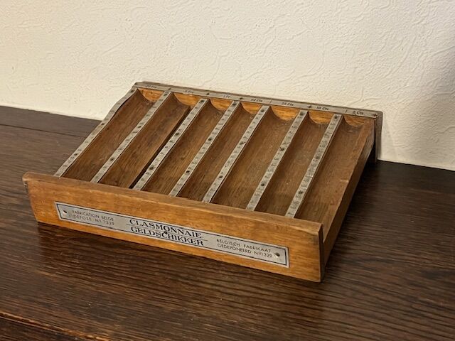 Antique wooden money dispenser for Belgian coins from the 1920s and 1930s. Made of wood with aluminum plates with markings. Designed for coins from 5 centimes to 20 francs. 22 x 17 cm.