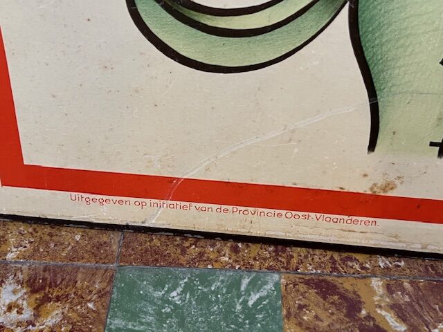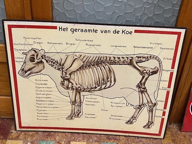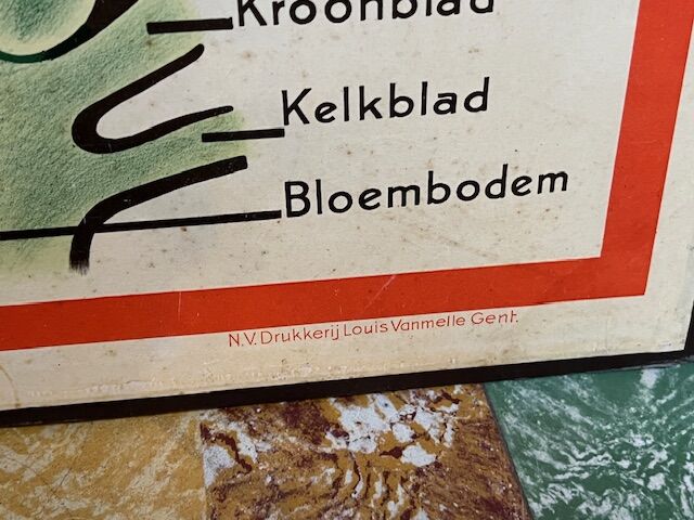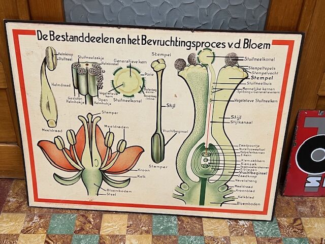 Old school poster from the 1940s, double-sided. On one side, the skeleton of a cow, and on the other, "the components and fertilization process of the flower." In very good condition considering its age. Printed by L. Vanmelle Ghent on behalf of the province of East Flanders. 84 x 64 cm.