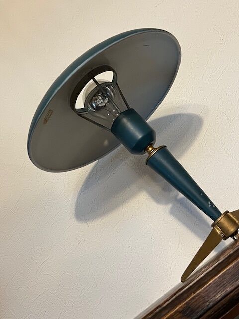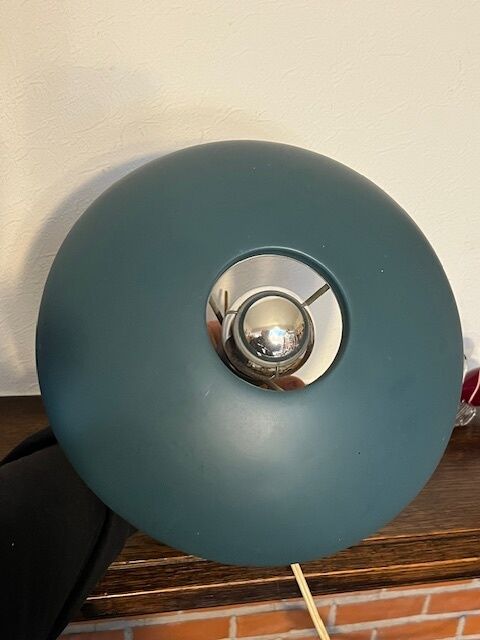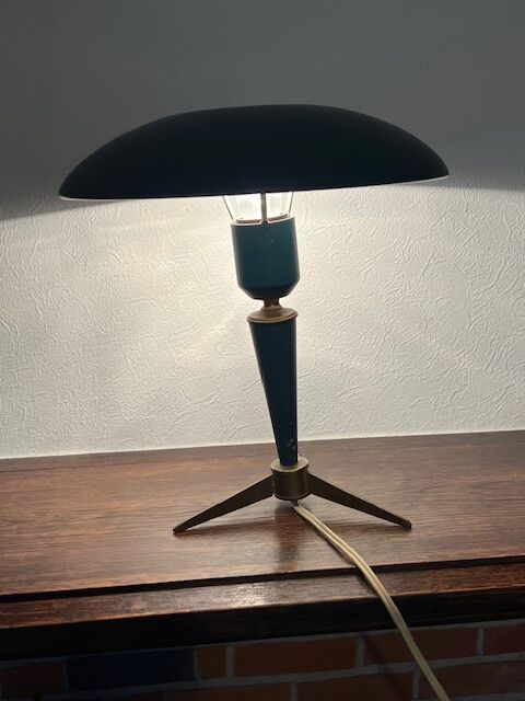 Mid-century desk lamp 'Bijou' - Louis Kalff Iconic tripod desk lamp with a round, UFO-shaped shade. The metal shade and stem are painted a dark blue-green. The tripod is finished in gold. The desk lamp is the Bijou model, a 1955 design by Dutch designer Louis Kalff (1897-1976) for Philips and inspired by the Evoluon in Eindhoven. The desk lamp was produced in the 1960s and 1970s. The lamp uses an E27 socket (bulb not included). The desk lamp is in vintage condition with some paint damage to the leg due to age. The shade itself is in perfect condition. There is a small crack on one of the le ... Read more