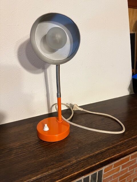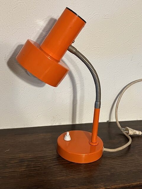 Small metal desk lamp from the 1970s. In good working order. The socket has been replaced with a new one. Height 32cm, base diameter 10.5cm.
