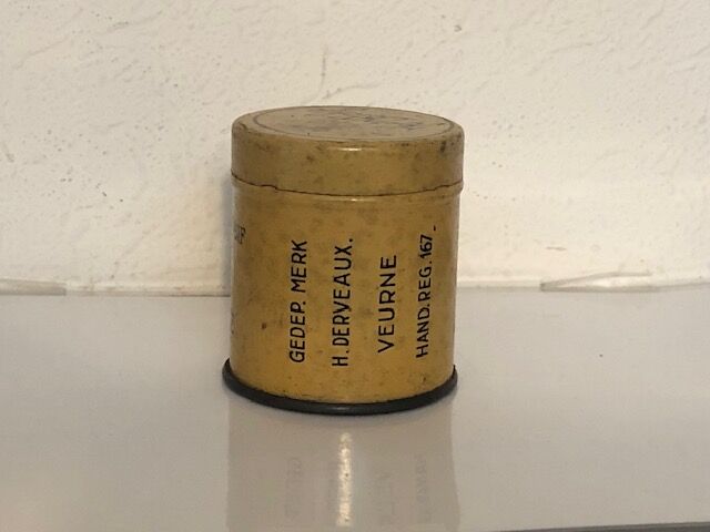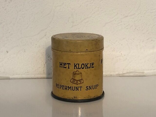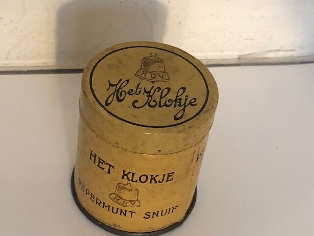 Boite en tôle vide de tabac a priser "Het Klokje de Furnes (Belgique). Diametre 4,7cm, hauteur 5,3cm. Beau sur le côté, mais rouille de surface sur le couvercle