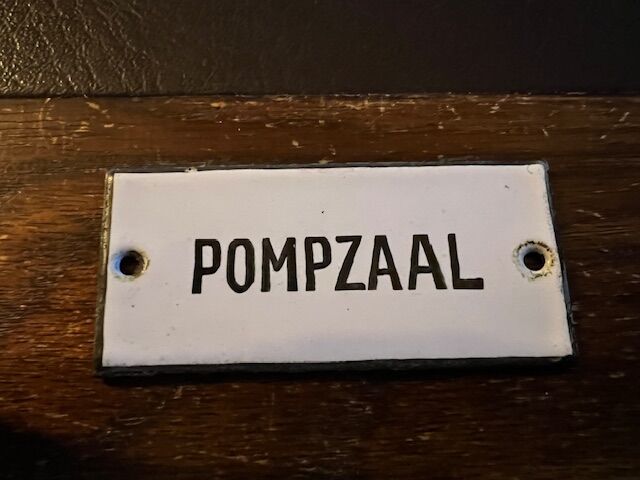 Ancienne plaque émaillée néerlandaise portant l'inscription « Pompzaal » (Salle des pompes). En parfait état. 7,5 x 3,5 cm.