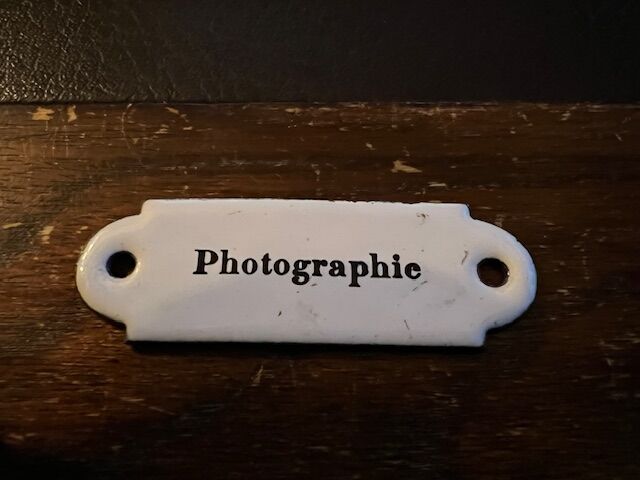 Ancienne plaque émaillée « Photographie », en parfait état. 7,5 x 2,5 cm