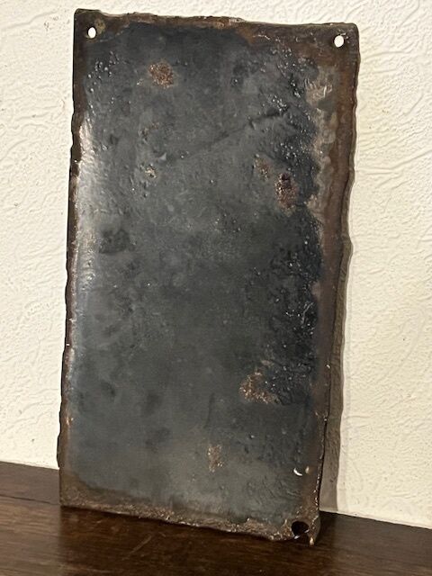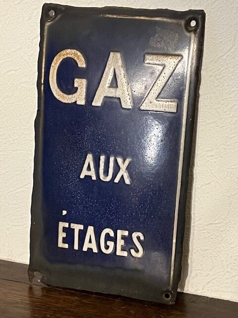 Plaque émaillée française « Gaz aux étages », probablement un avertissement à une époque où le gaz n'était pas encore largement disponible. En bon état décoratif, mais fortement patiné. 14 x 25 cm