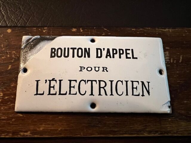 Ancienne plaque émaillée française « Bouton d'Appel pour l'Électricien ». L'émail est abîmé dans le coin supérieur gauche et, dans une moindre mesure, dans le coin inférieur droit. 10,5 x 5,8 cm. Convexe.