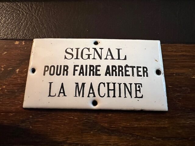 Ancienne plaque émaillée française « Signal pour faire arrêter la machine », probablement un panneau servant à signaler un arrêt d'urgence. Origine française, en parfait état, 10,8 x 5,8 cm.