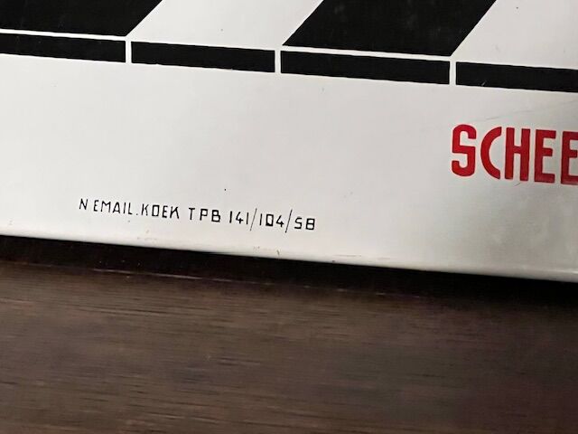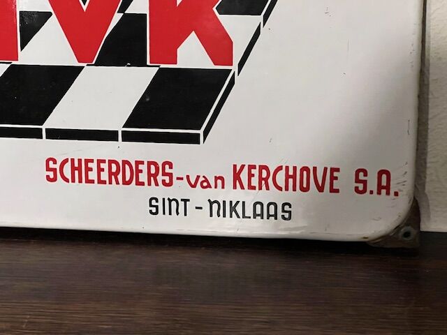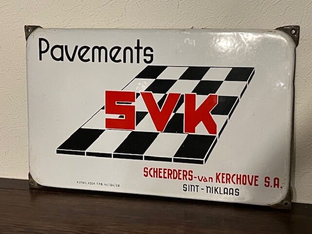 Plaque émaillée de 1958 de Pavements SVK (Scheerders Van Kerckhove SA, Sint-Niklaas), réalisée à l'atelier d'émail de Koekelberg. En très bon état. 39 x 24 cm.