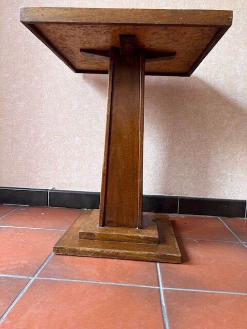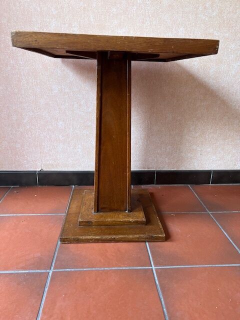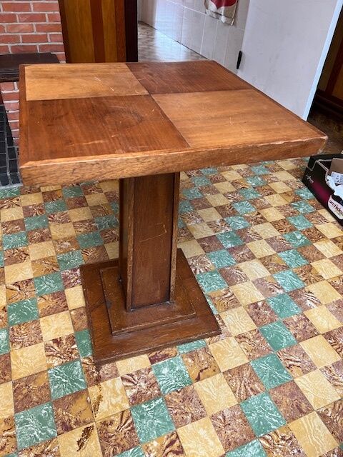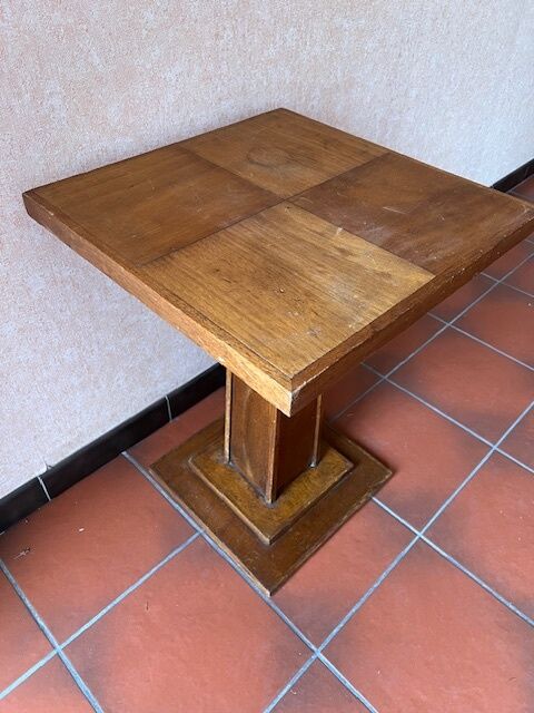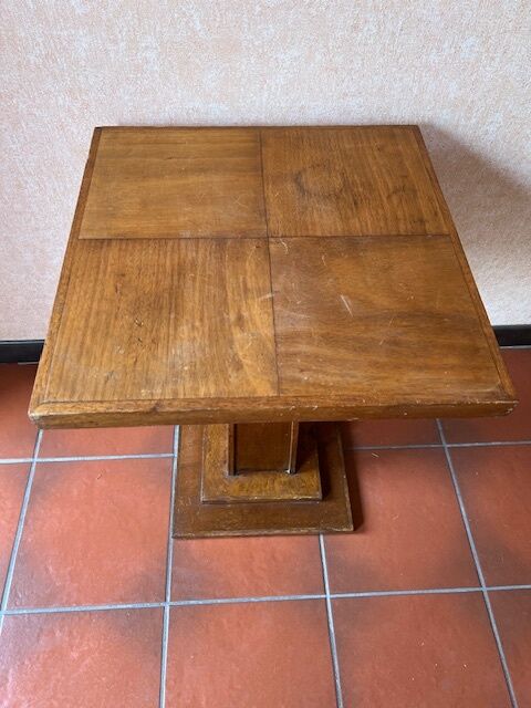 Guéridon Art Déco des années 50. Le plateau est en placage de chêne et présente quelques traces d'utilisation. Le bois n'est pas endommagé, mais présente quelques taches. Il est difficile de le montrer sur les photos, mais le pied est effilée et mesure 14 cm de large en bas et 10,5 cm en haut. Hauteur totale 64cm et le plateau mesure 49 x 49cm.