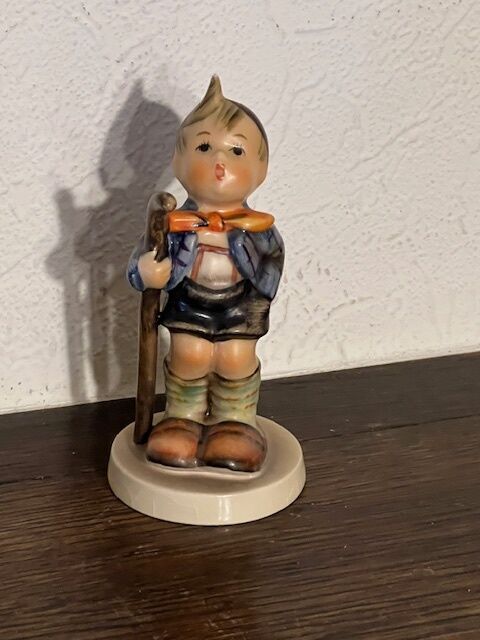 Figurine Hummel Petit Randonneur, estampillée TMK5. La figurine mesure 10 cm de haut.