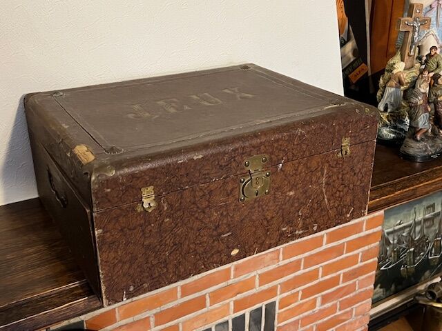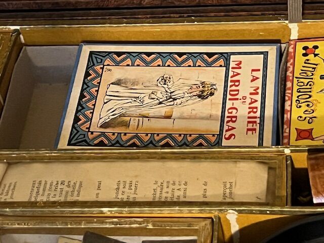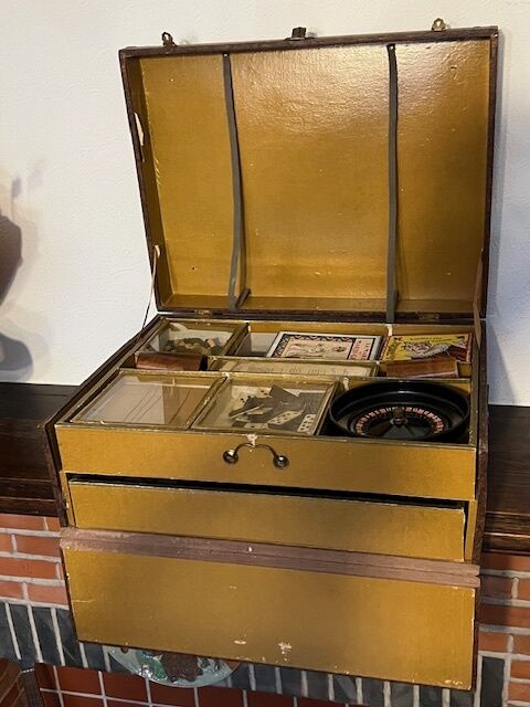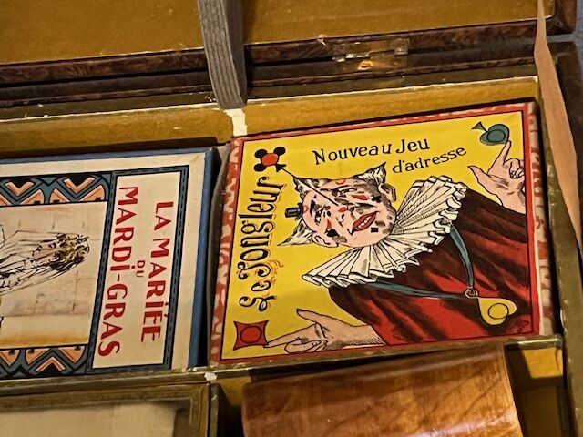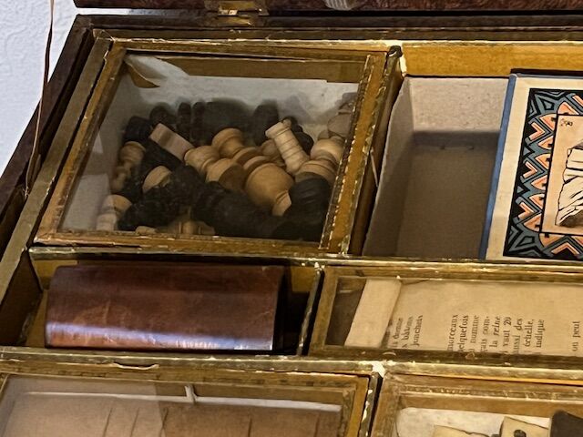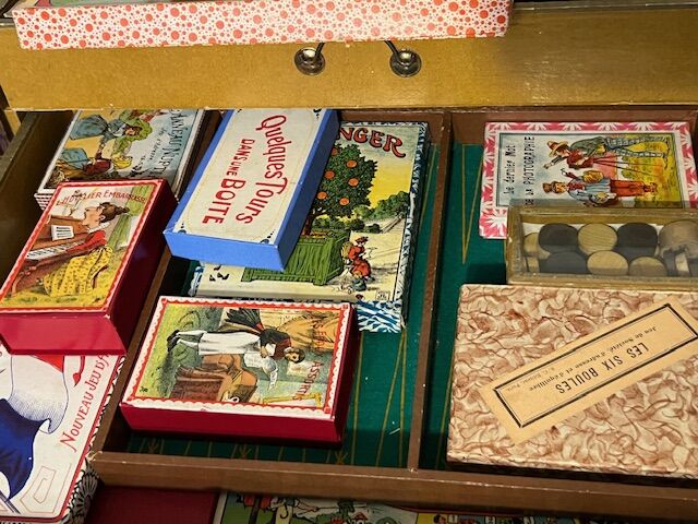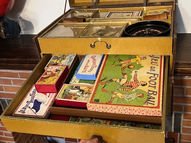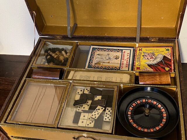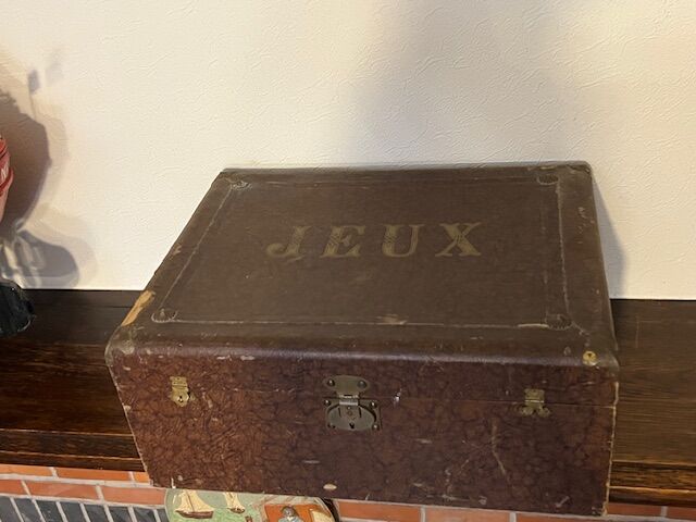 Coffre à jeux ancien, milieu du XXe siècle. Ce coffre contient une multitude de jeux de société français anciens. Dimensions : 43 x 33 cm et 19 cm de haut. Utilisé, mais en bon état.