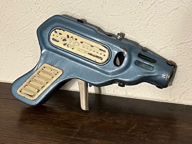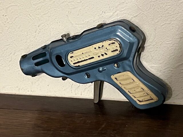 Pistolet à friction des années 1960. Un pistolet en tôle qui émet un son et produit des étincelles lorsqu'on appuie sur la gâchette. Le mécanisme d'étincelles ne fonctionne plus, mais le son, lui, est toujours là. Longeur 15cm. Dans son jus