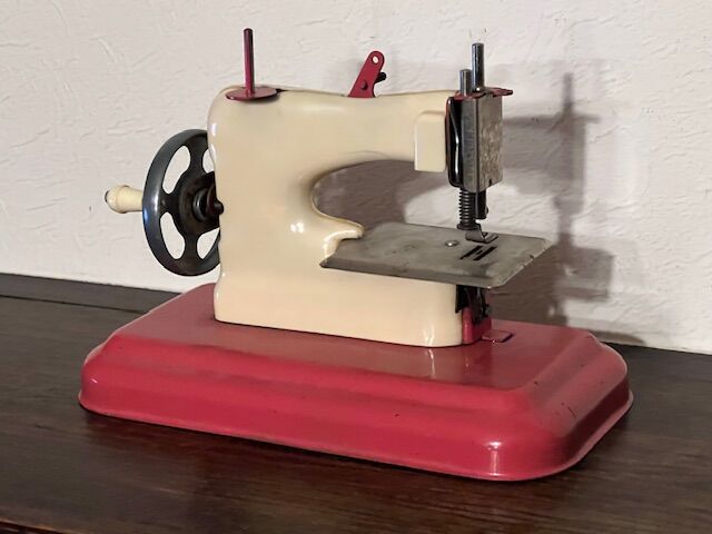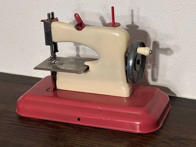 Machine à coudre jouet ancienne en tôle. En bon état. Mécaniquement fonctionnelle. Dimensions : 24,5 cm de long, 12,5 cm de large et 17 cm de haut.