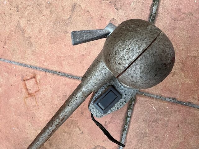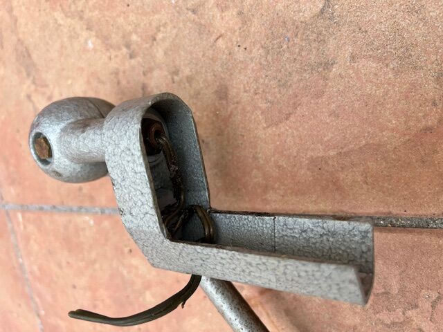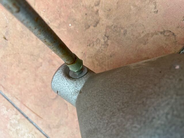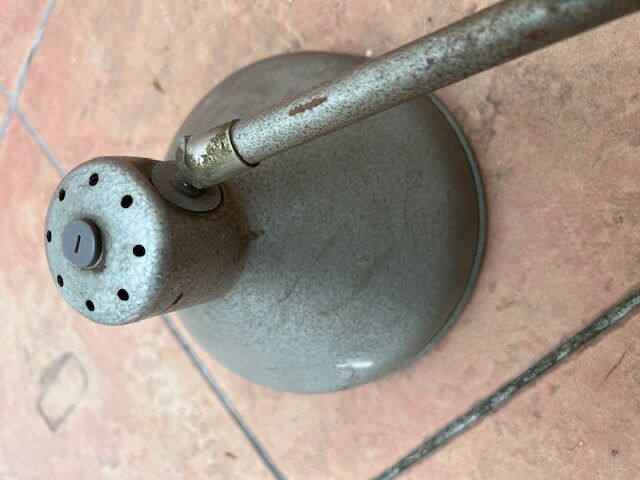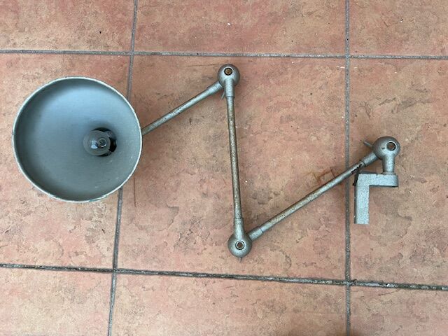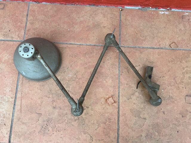 Lampe industrielle française de machines. Style Jieldé. Celle-ci ne porte aucune marque du fabricant. Trois bras pivotants se fixent par une vis de tension. Un léger enfoncement à l'intersection du bras et du capot est présent, mais cela ne gêne pas. La longueur maximale du bras (capot non inclus) est de 90 cm. Cette lampe était de couleur gris industriel, mais une grande partie de la peinture a disparu, ce qui lui confère une belle patine.