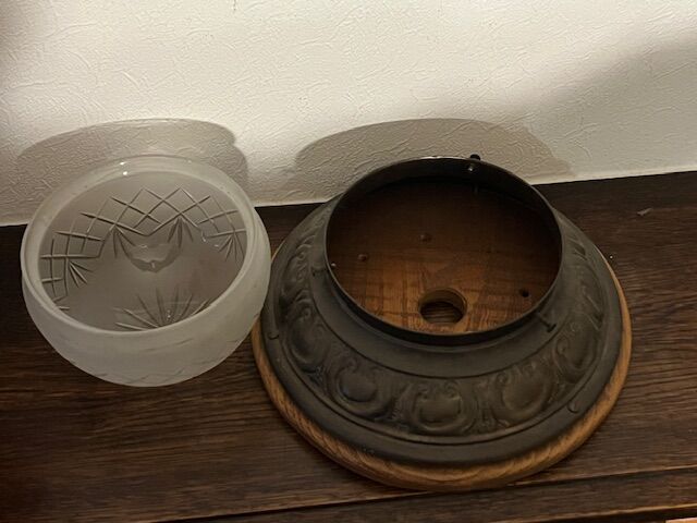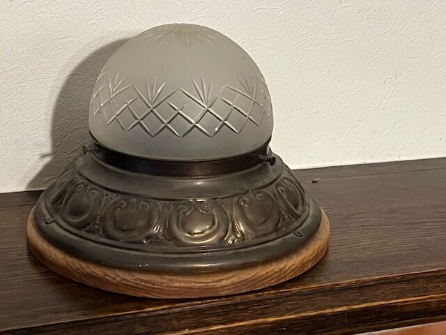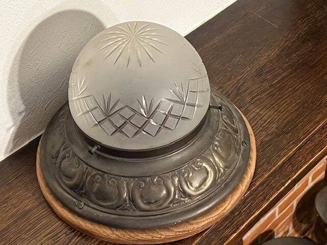Plafonnier ancien en verre taillé avec monture en laiton. L'ensemble est monté sur une rosace en bois. L'applique et le câblage ne sont pas inclus, mais peuvent être facilement ajoutés. Début du 20me siècle