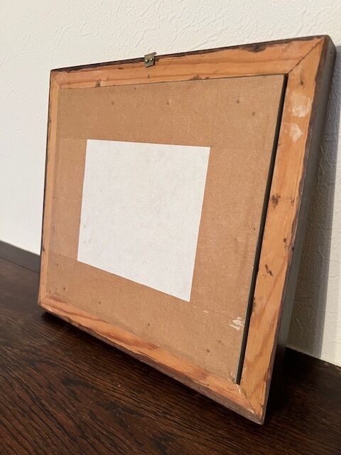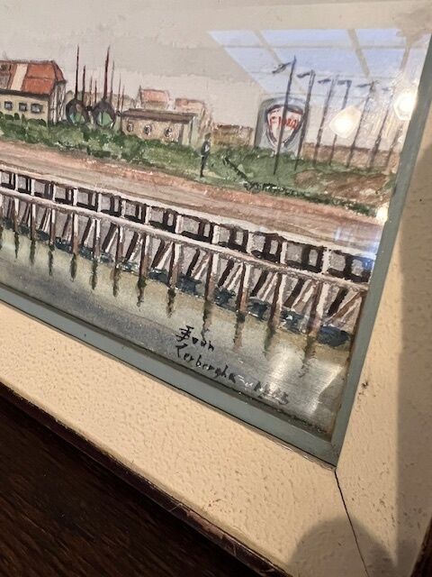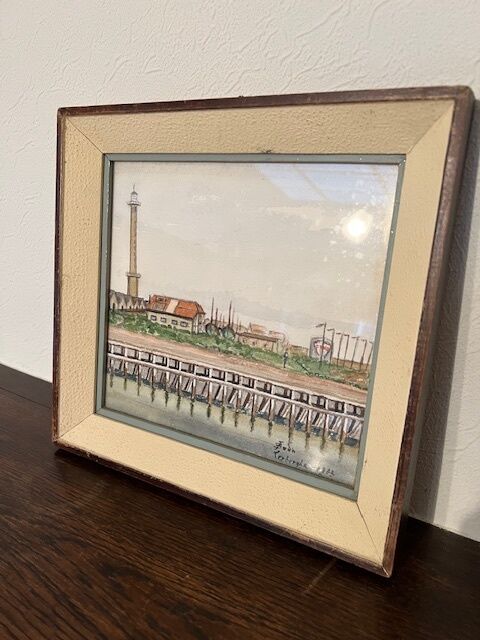 Klein aquarel werkje uit 1962. Naam van de artiest niet te ontcijferen. Ingekaderd en achter glas. Aan het kader te zien, vermoedelijk uit de jaren 50. Op het schilderijtje is volgende te zien; een vuurtoren, staketsel, scheepswerf met werkhuizen, reclame van Fina, enz… Totale afmetingen 28 x 28cm.