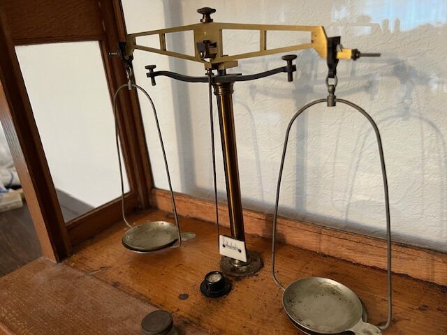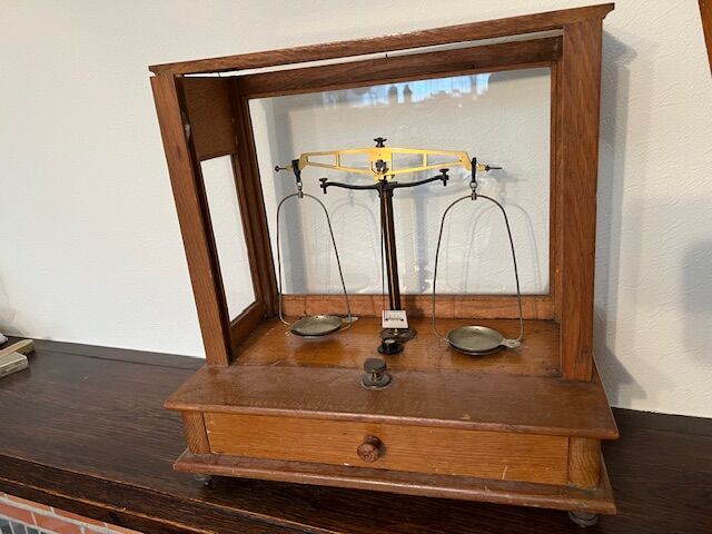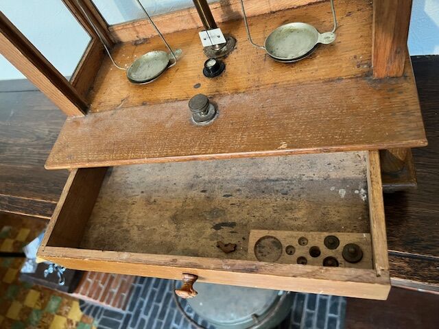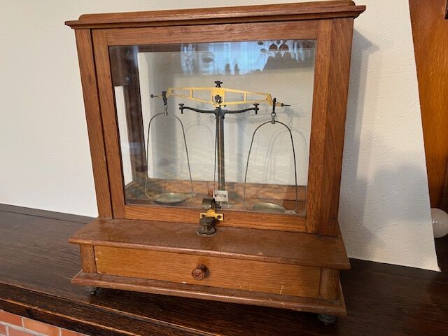 Antieke apothekerweegschaal in kastje. In zeer goede werkende staat. Zowel het weegmechanisme, als de regelbare messing pootjes als het waterpasje. Geen markeringen van de fabrikant aanwezig. 38cm breed, 40cm hoog. Binnenin de lade is een houderje bevestigd voor de gewichtjes. Er zijn er nog enkele aanwezig. De behuizing is uit eik, het mechanisme uit messing. Mooi decoratief en functioneel object.