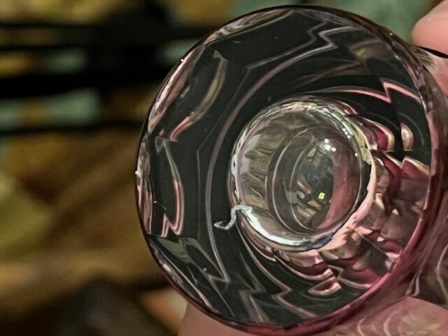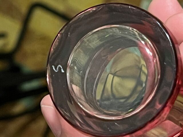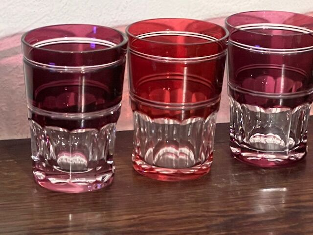 6 handgeslepen kristallen theekoppen van Val Saint Lambert. 3 paarse en 3 in rose/paarse kleur. Allen in perfecte staat, met markering “S” op de bodem. Hoogte 8,5cm, Diameter boven 6,2cm, diameter onderaan 4,7cm.