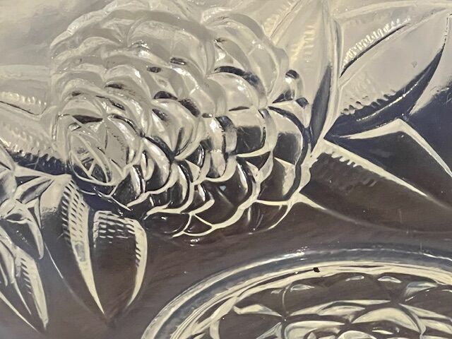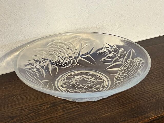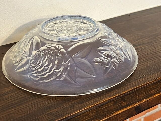 Franse schaal uit opaalglas (Opalescent glas) Art Deco stijl, in perfecte staat. Geen merknaam te zien. Motief met denneappels. Diameter 25cm