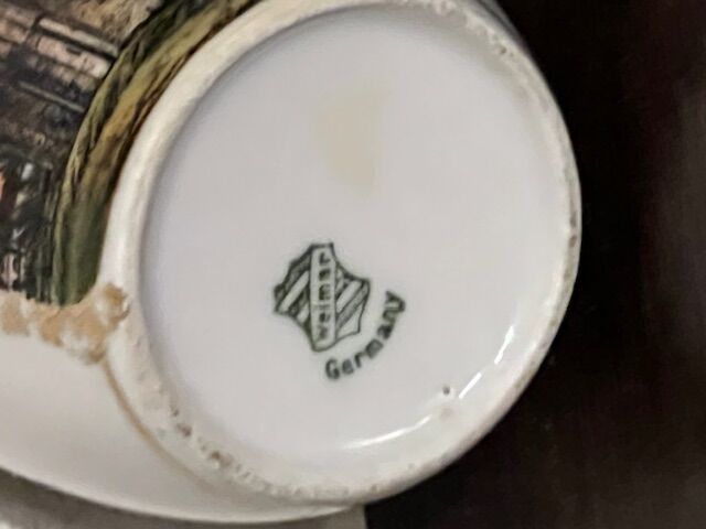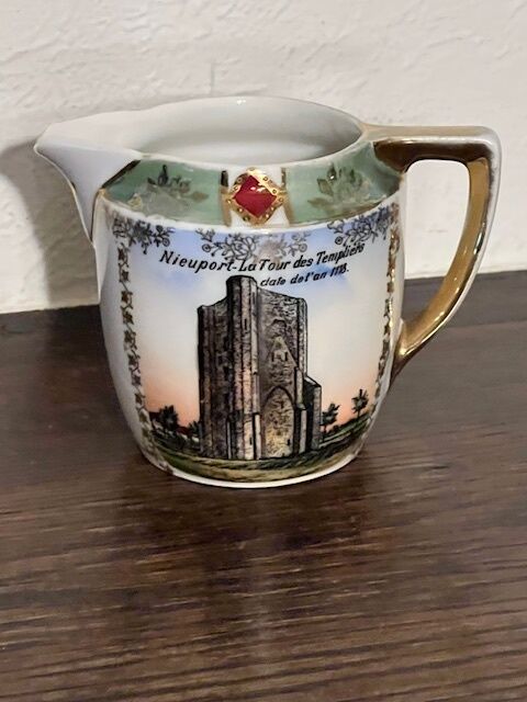 Oud melkkannetje als souvenir van Nieuwpoort. Uit de periode 1920-30. La Tour des templiers, In perfecte staat. Hoogte 7cm. Gemaakt door Weimar, Duitsland