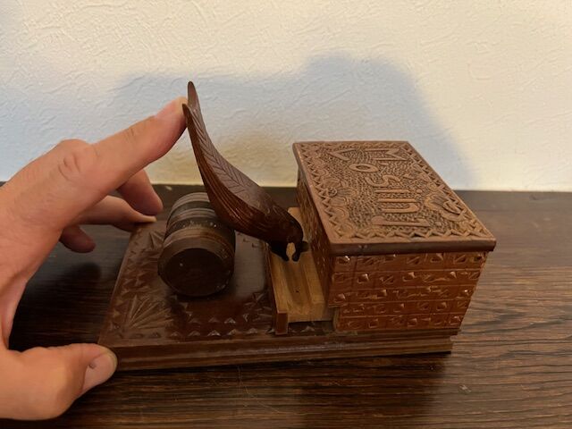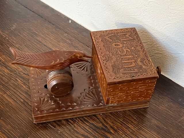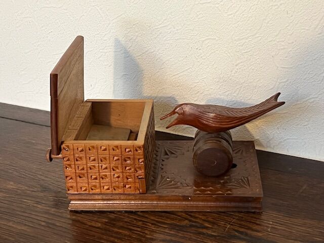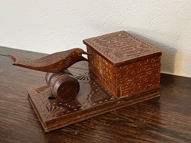 Oude houten handgemaakte mechanische sigarettenhouder. In perfect werkende staat. Ook optisch in topconditie! Handgemaakt. Afmetingen: 17 x 10 cm. Waarschijnlijk afkomstig uit Oost-Europa.