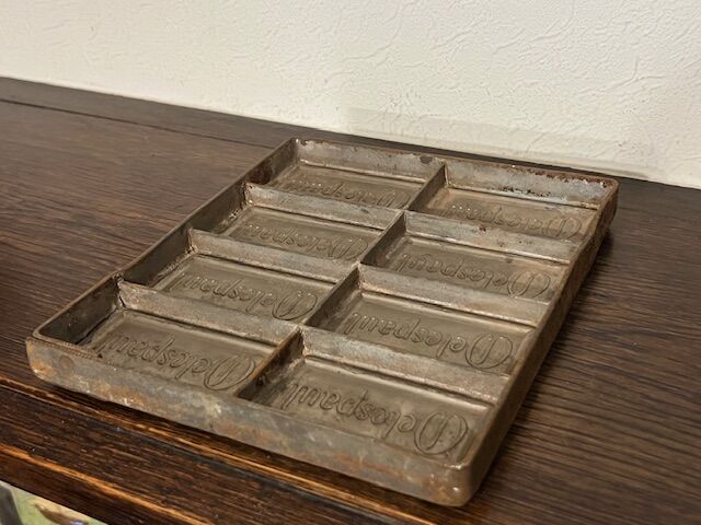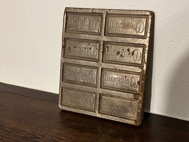 Metalen chocoladevorm voor 10 repen van de Franse fabrikant Delespaul Havez. Op elk blokje van de chcolade staat een ander karakter. Enkel geschikt voor decoratieve doeleinden. Elke reep meet 8x4cm, totale afmetingen van de vorm is 20 x 17,5cm. In gebruikte staat.