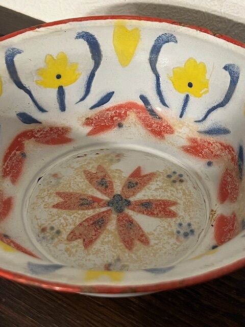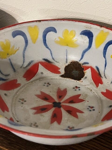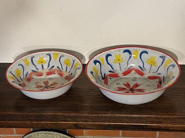 2 oude geëmailleerde kommen met bloemmotief. Ze hebben een zwaar leven achter de rug en hebben wat schade. Ze zijn desondanks nog zeer decoratief en waterdicht. 21 en 26cm diameter.
