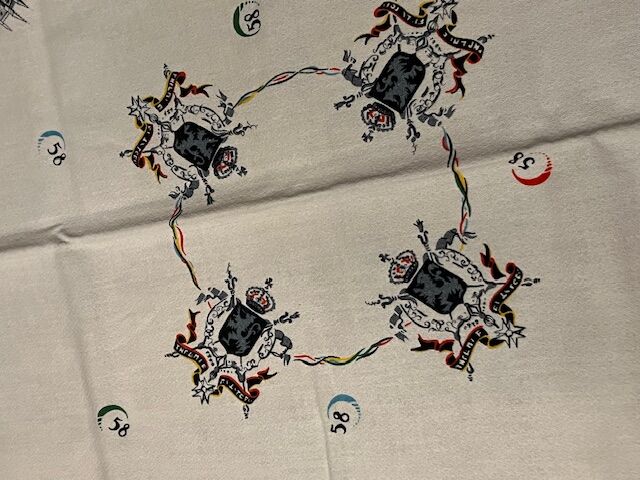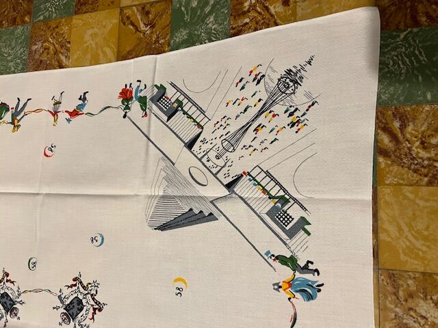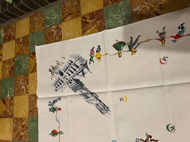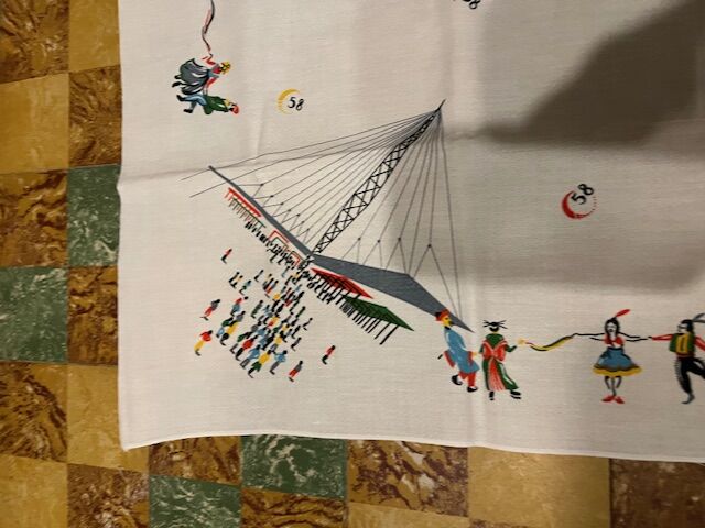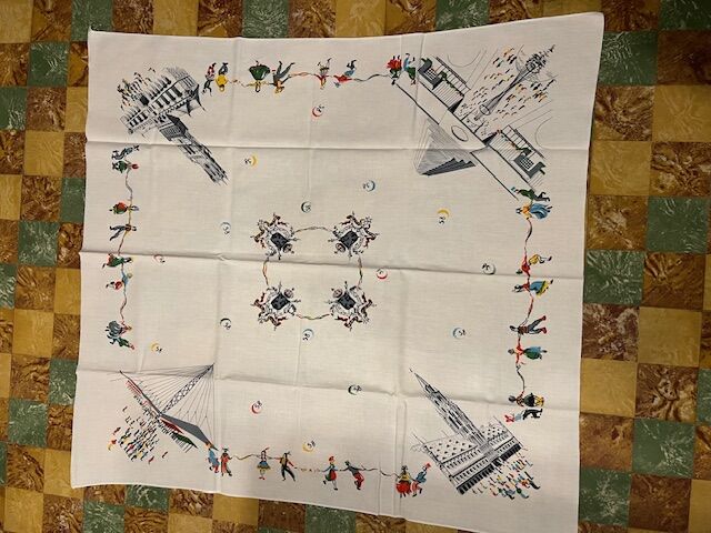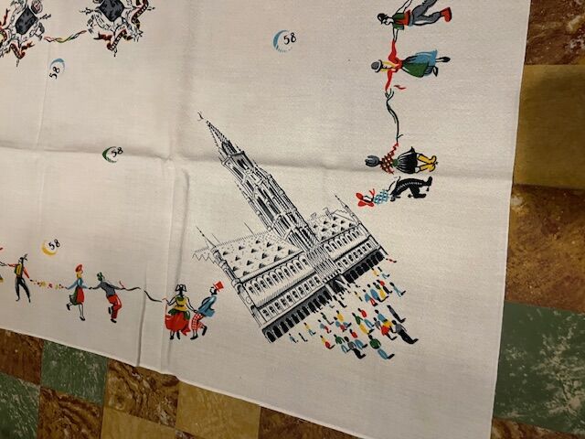 Zeer zeldzaam linnen tafelkleed van Expo 58 in perfecte staat!! 90 x 90cm. Op elke hoek en in het midden staan Expo 58 geralteerde afbeeldingen of afbeeldingen van Stad Brussel.