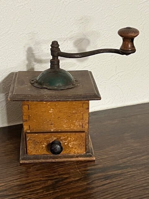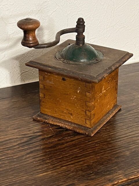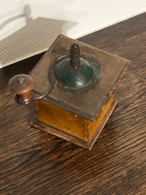 Oude pepermolen in de vorm van een koffiemolen. In mooie staat, “dans son jus”, Totale hoogte 14cm (hendel inbegrepen), basis meet 10 x 10cm