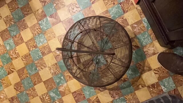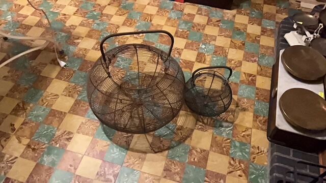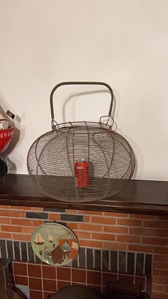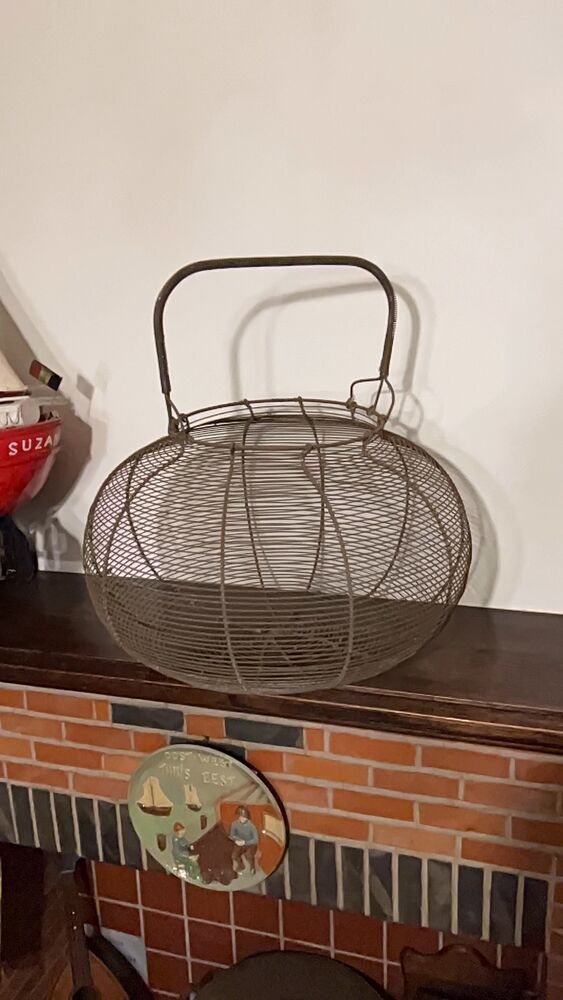 Gigantische Franse eiermand in draadstaal. Diameter is maar liefst 43cm, totale hoogte 46cm. In nette staat voor de leeftijd. Om een idee te hebben zit er op één van de foto's een standaard colablik in, op de andere foto staat de mand naast een gewoon standaard eiermandje.