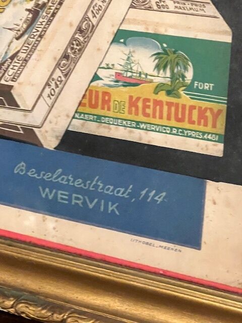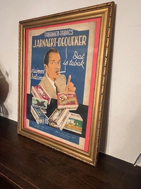 Oude affiche van de Wervikse tabaksfabrikant J Arnaert Dequeker uit Wervik. De affiche is netjes ingekaderd in een klassiek goudkleurig kader. In zeer goede staat. De affiche meet 33 x 87cm. Het kader 44cm x 57cm. Gedrukt bij Lithobel in Menen. De affiche dateert van de periode voor 1960 gezien er nog in oude spelling gewerkt wordt.