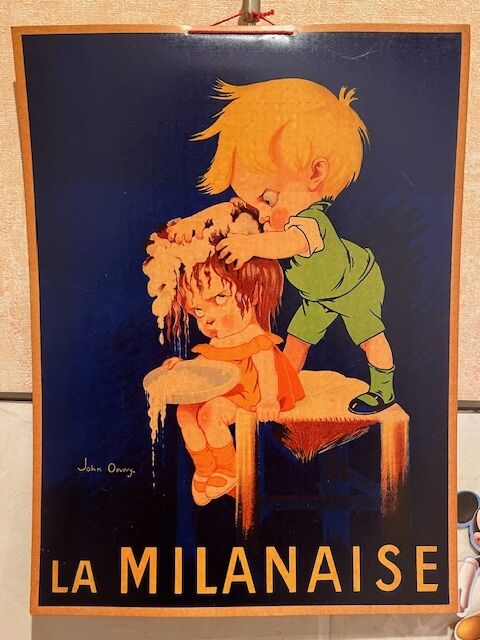 Oude reclame affiche van kindershampoo La Milanaise, uit de jaren 1920-30. In zeer goede staat en 100% origineel. Getekend door John Onwy. 30 x 40cm. Voorzien van een origineel stukje touw om op te hangen. Zeer decoraties verzamelobject