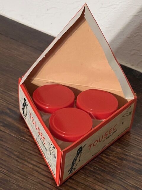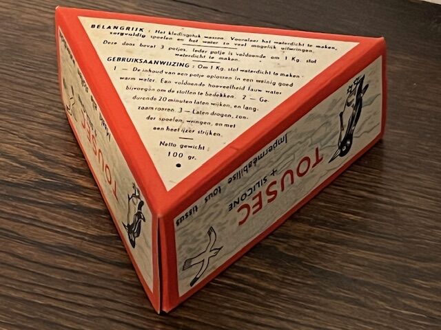 Vintage verpakking van Tousec, een product om stof waterdicht te maken. Mooie en decoratieve verpakking, met pinguins en meeuwen. Op de onderkant staat de gebruikershandleiding in Nederlands uit de jaren 1960. Binnenin zitten nog de 3 potjes product ongeopend, maar uiteraard niet meer bruikbaar door de tand des tijds. De gelijkzijdige driehoek meet 11,5cm.