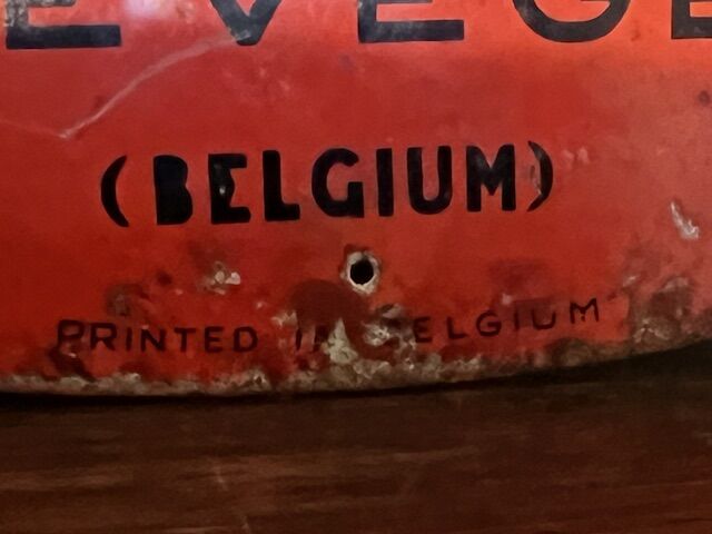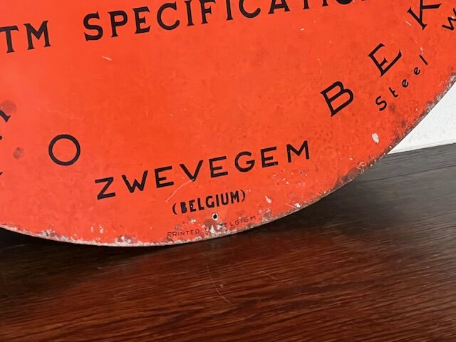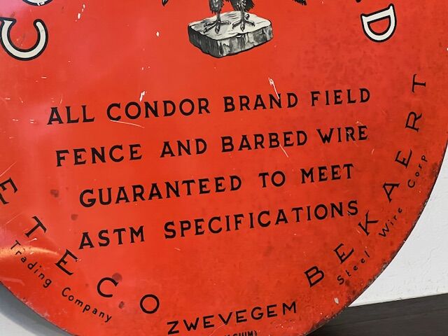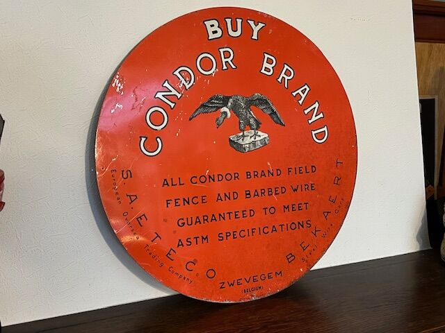 Rond blikken reclamebord van de Belgische fabrikant van hekwerk en prikkeldraad Condor Brand uit Zwevegem. In geleefde, maar nog mooie staat. Diameter 51cm. Het bord is eveneens geproduceerd in België