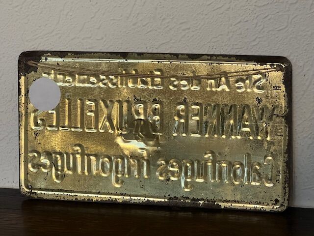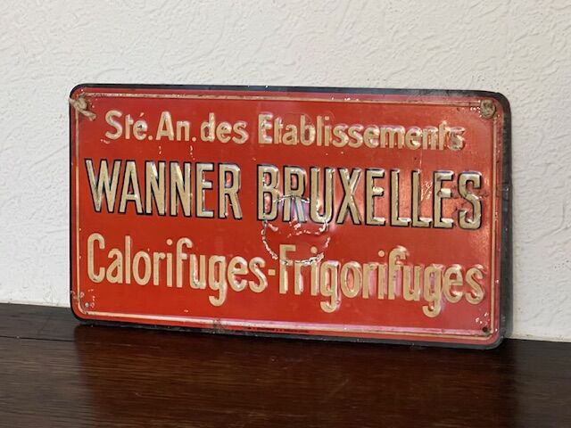 Reclamebordje van de jaren 1940-50 in blik. In reliëf. Van “Etablissements Wanner Bruxelles”, koeltechniek. Wat schade van de ouderdom, maar nog steeds een zeer mooi en quasi onvindbaar object. 20 x 11cm.