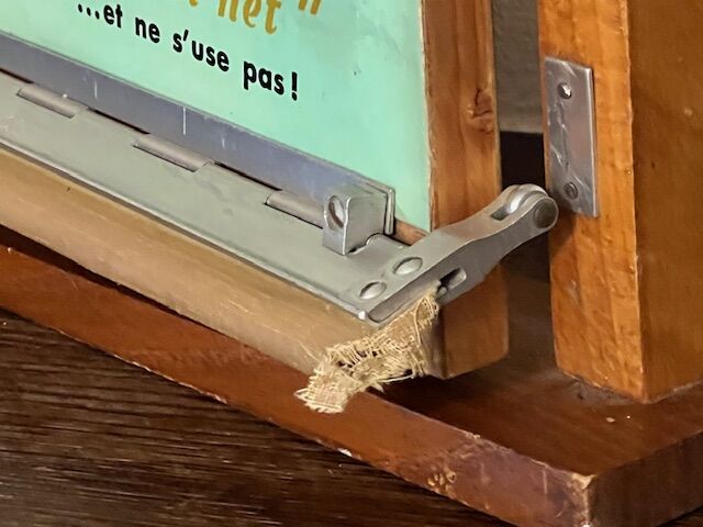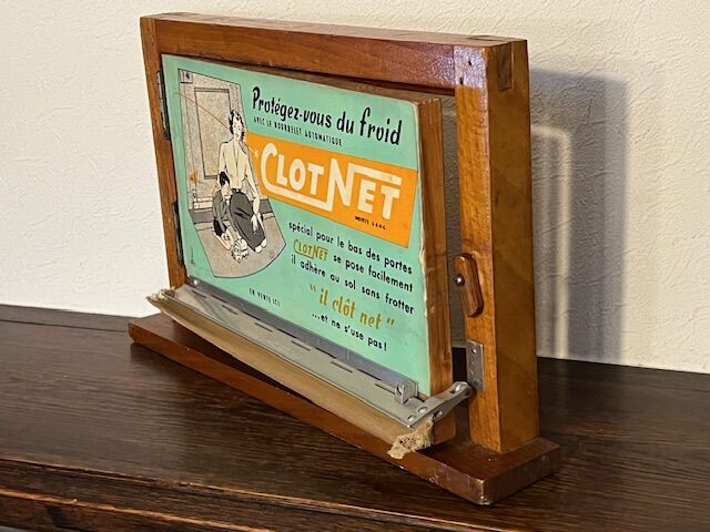 Vintage reclame voor “Clotnet”, een automatisch sluitende tochtstrip voor de onderkant van de deur. Het is een gepatendeerd product. Het demo model toont aan hoe het systeem werkt, als de deur gesloten wordt, duwt een mechanisme de tochtstrip tegen de vloer. Dit object stond in winkels die dat product verkochten. Deze winkel display is 40cm breed en 26cm hoog en in zeer goede staat.