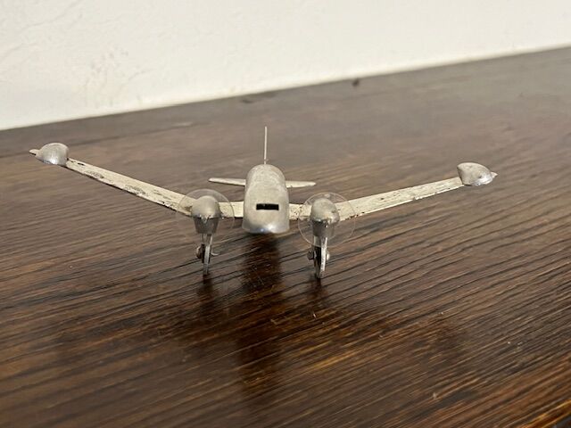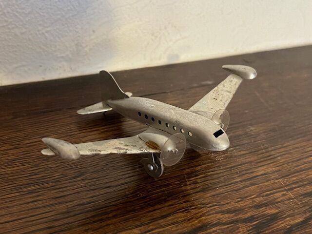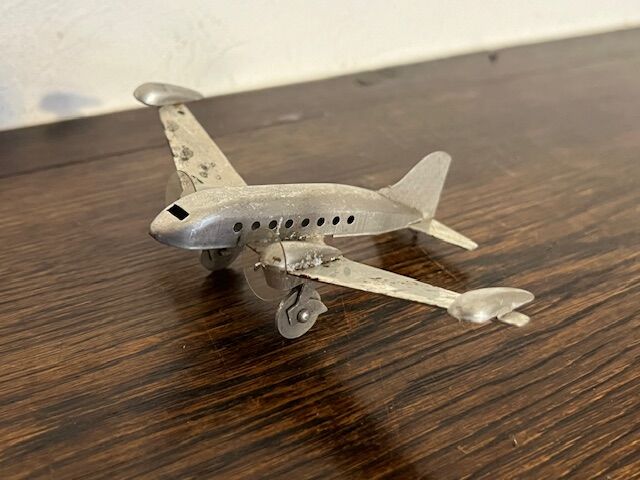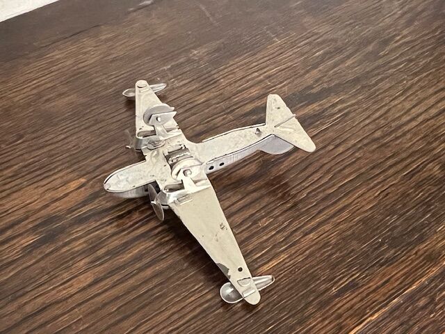 Klein blikken speelgoed vliegtuigje. DC3. Gemaakt in Frankrijk. De propellertjes zijn gemaakt uit mika. Lengte 9,5cm, spanwijdte 14cm.