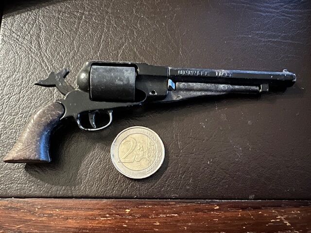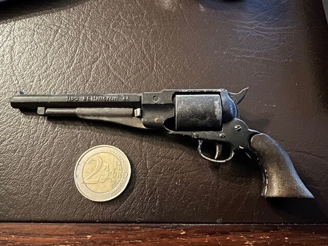Miniatuur metalen speelgoedgeweertje “Reminton 44”, gemaakt door Uniwerk. In zeer goede staat. Werkt met poffertjes. Lengte van het geweertje is 14,5cm.